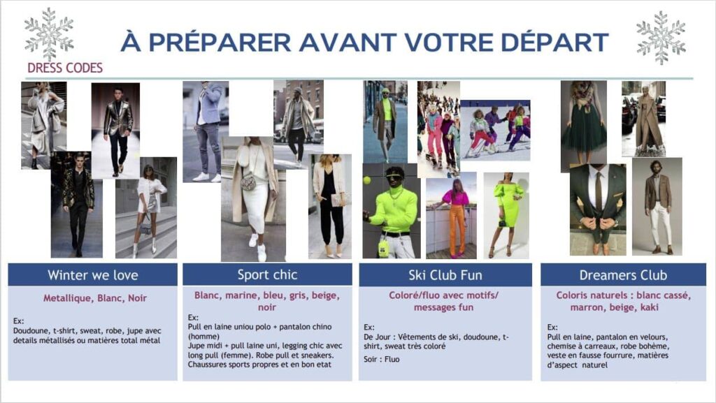 La recruteuse décrit une soirée typique au Club Med. Dans cet exemple, la jeune employée termine son travail avec les enfants à 17 h. Elle va ensuite à sa chambre pour une pause et se changer. Elle est ensuite attendue au bar pour 19 h 15. Chaque soir, le Club Med exige un code vestimentaire selon l’un des sept thèmes. « On prend l’apéro. On n’est pas obligé de boire avec le client, il faut juste échanger avec le client », précise la recruteuse.