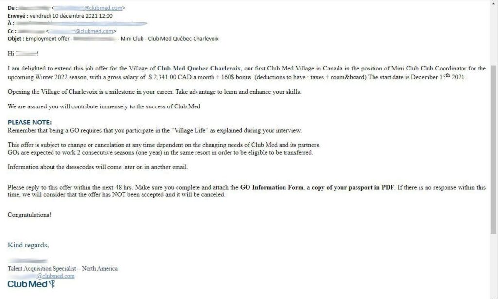 Ce sont des étudiant·es qui ont postulé à des postes d’animation qui nous ont alertés. « On me demandait d’être disponible pour les clients en tout temps, au-delà de mes 40 heures de travail par semaine », a commenté l’une d’elles, sous le sceau de la confidentialité. « Finalement, c’est en dessous du salaire minimum ! » Ces étudiant·es, qui terminaient leurs études collégiales l’automne passé pour ne reprendre leurs études qu’à l’automne prochain se cherchaient un travail cet hiver. Tous et toutes ont été étonné·es des conditions offertes au Club Med.