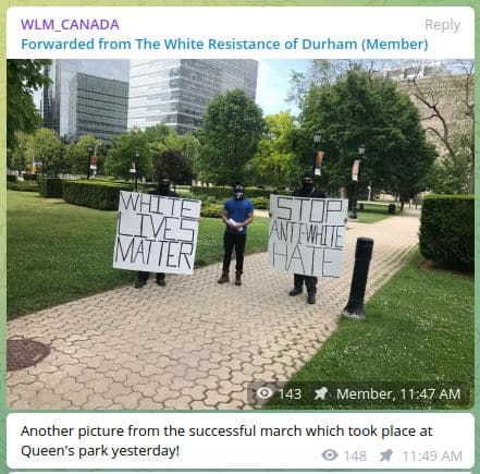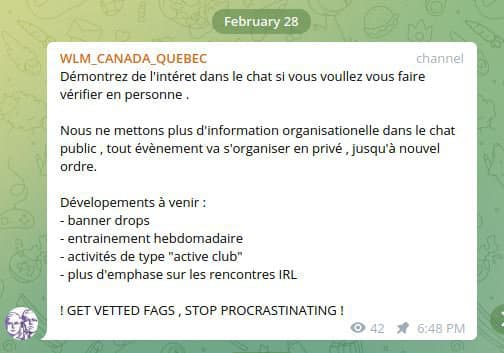 Au Canada, d’après nos observations, il semblerait que ce soit à Toronto que le mouvement a pris racine. Un internaute anonyme utilisant le pseudonyme McLeafin serait à l’origine de ce groupe. McLeafin, si l’on en croit ses messages sur Telegram, est également impliqué dans Active Club Canada, l’équivalent canadien du Rise Above Movement (RAM), un précurseur de WLM. Le RAM est un organisme californien d’extrême droite, un genre de « fight club » raciste permettant aux militants de se rencontrer pour pratiquer des sports de combat et faire des push-ups en groupe.