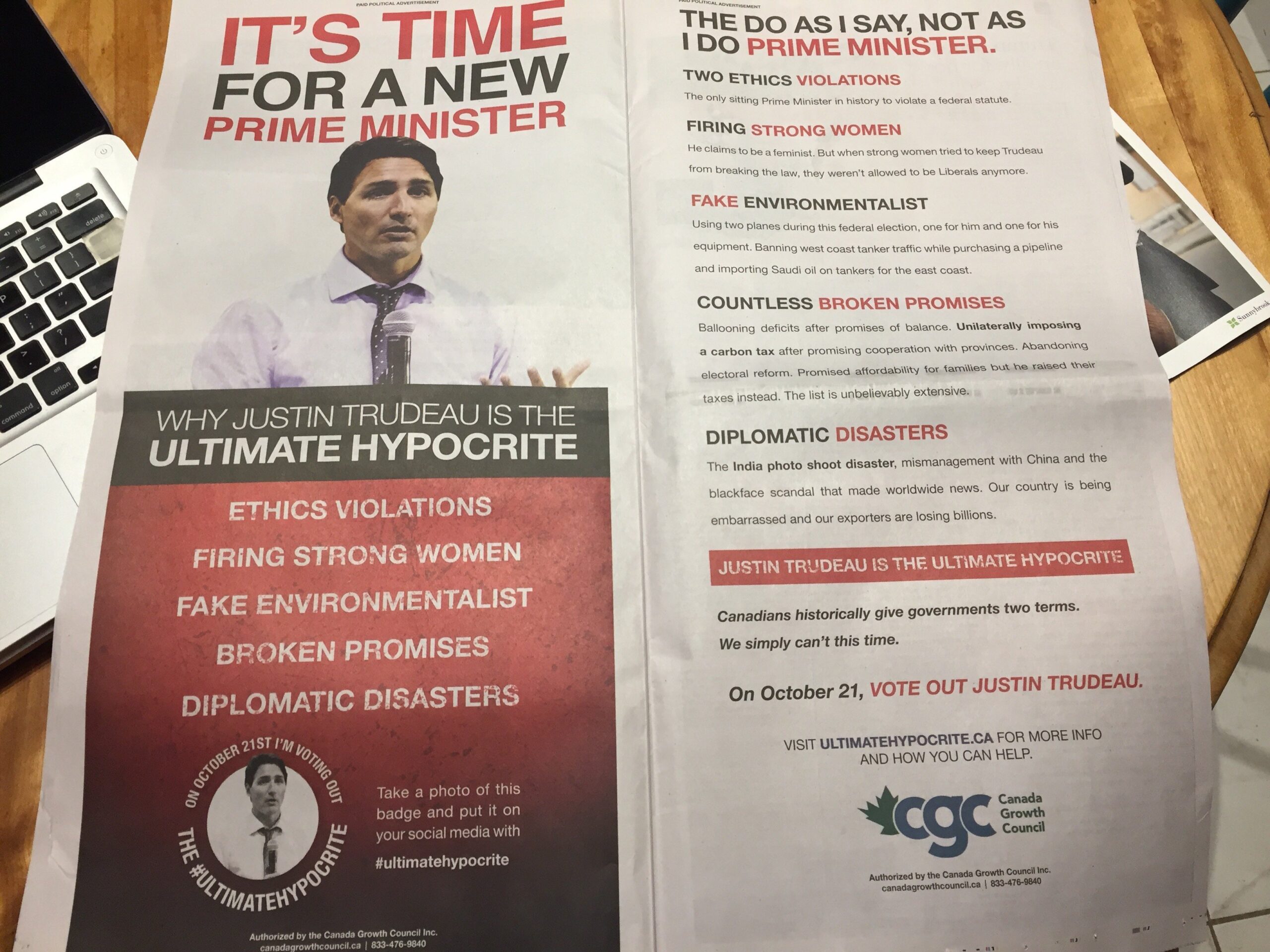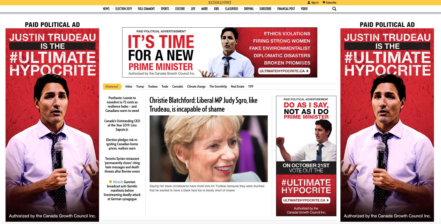 Le CGC a fait installer des publicités sur des panneaux d’affichage, dont celles qui appelaient les électeur·trices à ne pas réélire l’ancien ministre de la Sécurité publique et de la Protection civile Ralph Goodale, en plus d’acheter des publicités pleine page dans le National Post et dans le Globe and Mail.