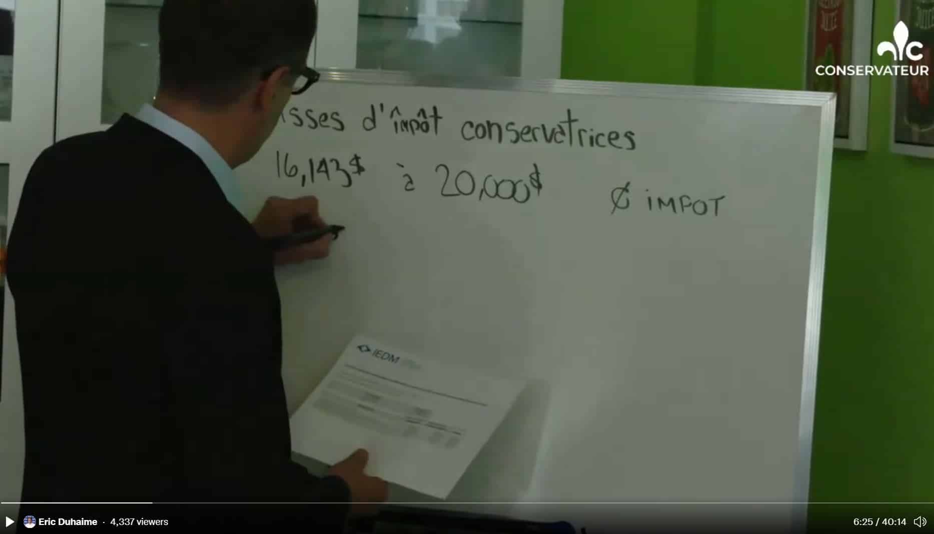 Le 30 août dernier, alors qu’il présentait les baisses d’impôts promises par sa formation politique dans une cuisine de la Rive-Sud de Québec, Éric Duhaime écrivait sur un tableau blanc en consultant une feuille de notes arborant le logo de… l’Institut économique de Montréal.