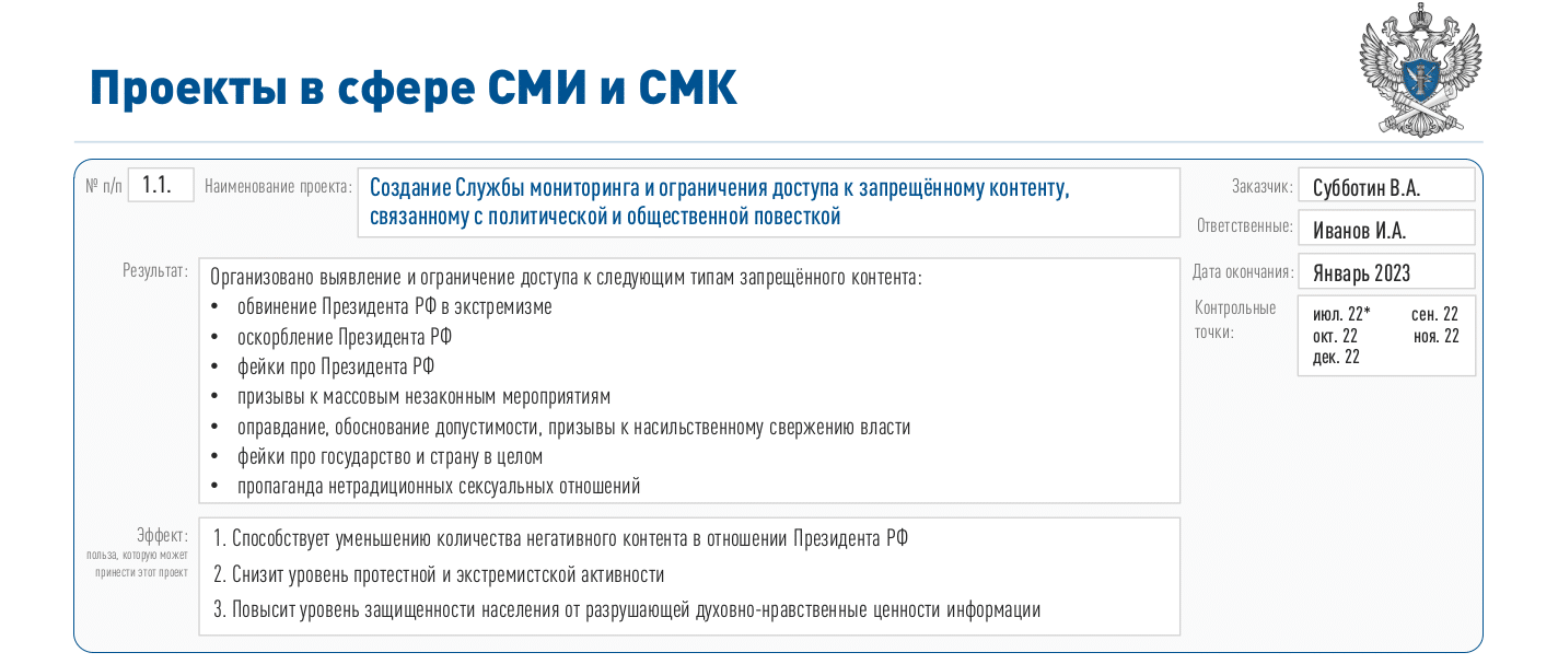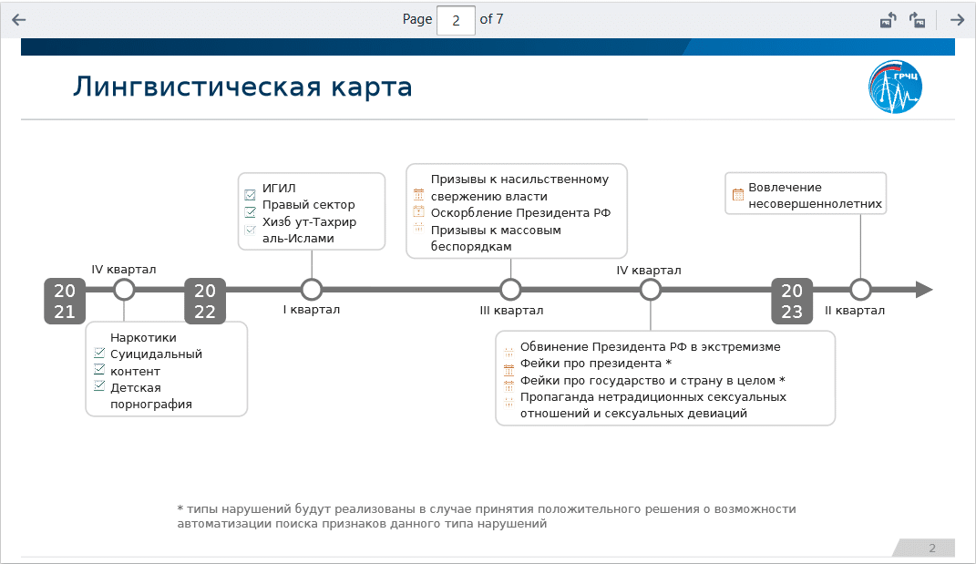 Le plan présenté par le CPR parle de développer la détection automatique des appels au « renversement violent du pouvoir », des « appels aux émeutes », ainsi que des « insultes envers le président de la Fédération de Russie ». Cette étape devait se terminer avant la fin 2022.