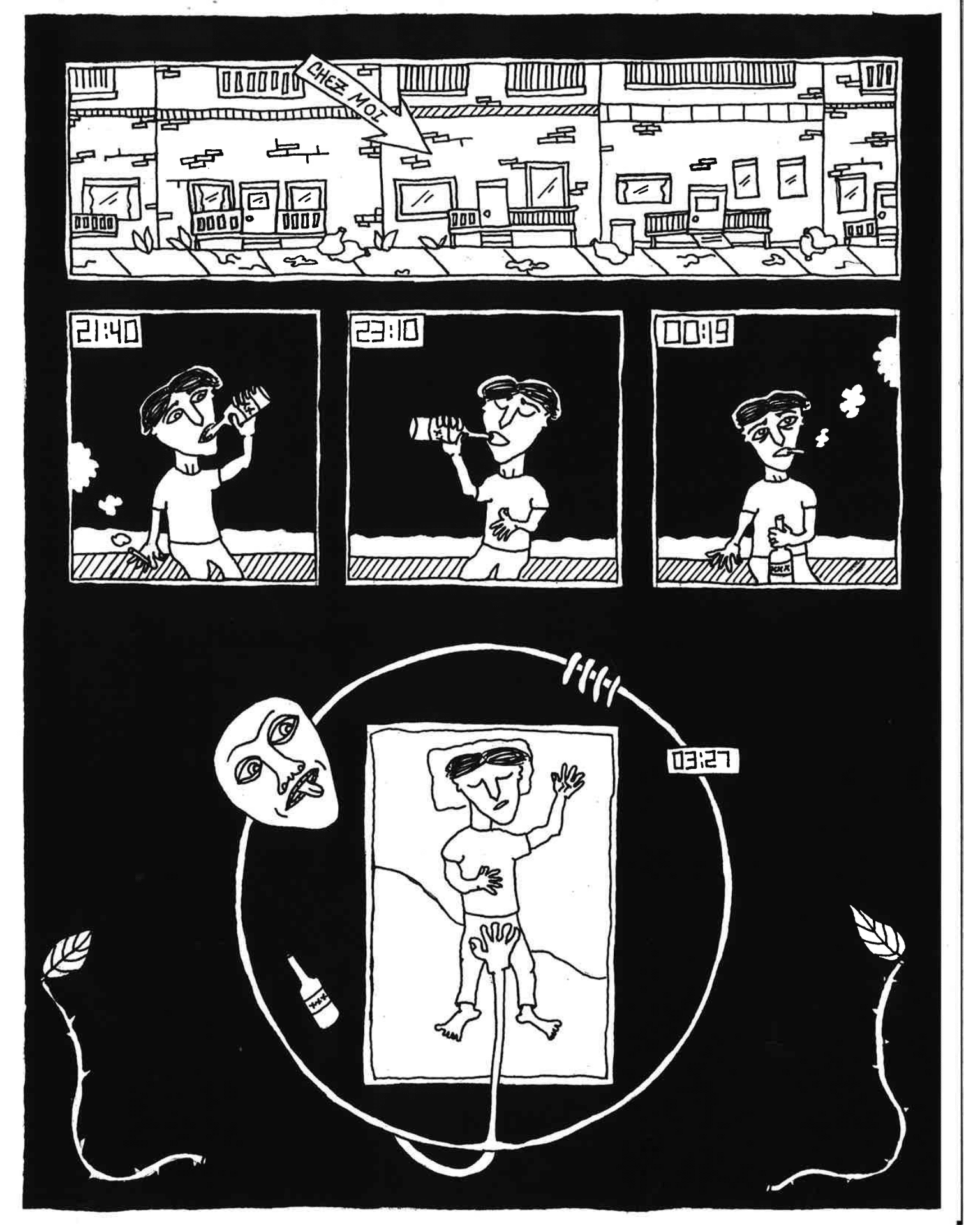 Des dessins blancs sur fond noir retracent le passage forcé de l’adolescence à l’âge adulte du bédéiste Rémo, qui nous livre dans cet ouvrage autobiographique aux traits tranchants un récit sincère et percutant sur les abus sexuels qui ont conditionné sa jeunesse. Une œuvre de guérison et de témoignage, pour que les violences ne tombent pas dans l’oubli.