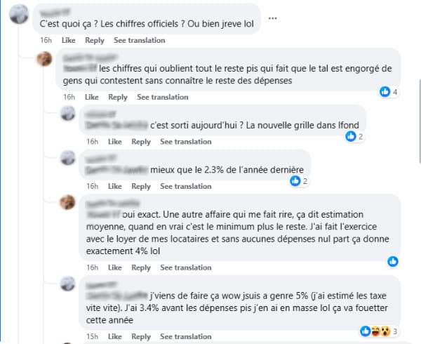 Une autre internaute se plaint qu’en raison des augmentations de loyer, « ça va chialer pareil [chez les locataires] », ce à quoi une personne répond « exact » avec un émoji de personne qui rit à en pleurer.