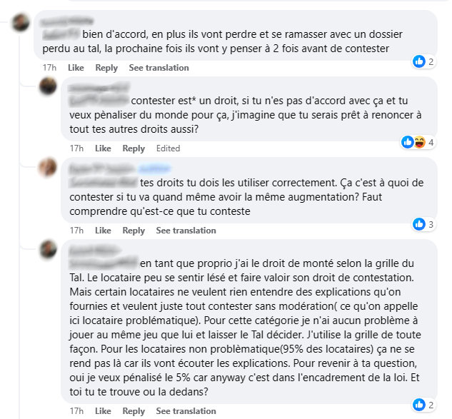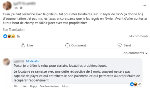 Alors qu’une personne répond que les locataires ont le droit de contester une augmentation, un autre membre rétorque que ces droits doivent être utilisés « correctement ». « Mais certains locataires […] veulent juste tout contester sans modération (ce qu’on appelle ici locataire problématique) », renchérit l’internaute qui affirmait que les locataires allaient regretter d’être allés devant le tribunal.