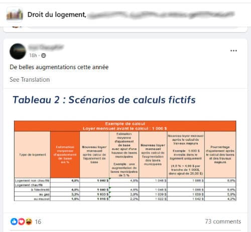 L’annonce récente des hausses de loyer historiques suggérées par le Tribunal administratif du logement a été rapidement saluée dans les groupes privés de propriétaires sur le réseau social Facebook. Le sujet a suscité des questions de propriétaires désirant s’informer sur diverses modalités entourant l’augmentation des loyers. Les réponses douteuses véhiculées soulèvent la nécessité de mesures concrètes pour faire respecter les droits des locataires, selon les comités logement.