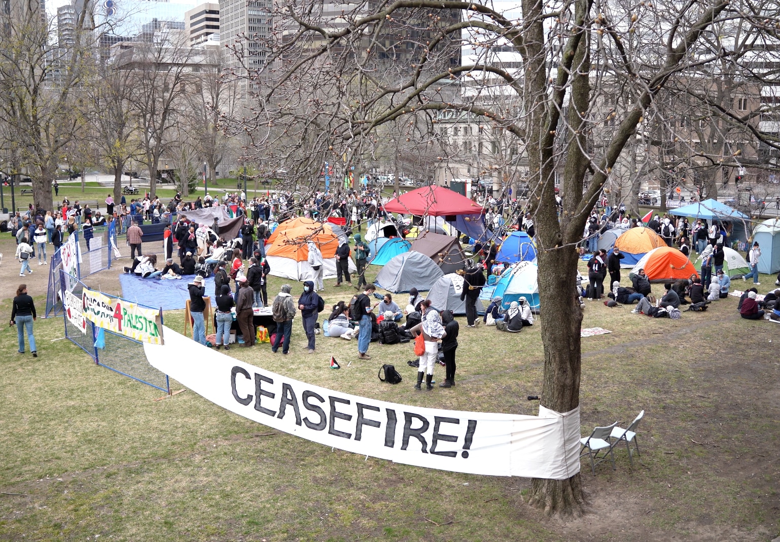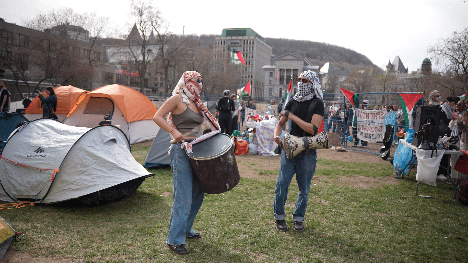 Une vingtaine de tentes étaient déjà installées samedi en fin de journée. Lundi, ce nombre avait déjà triplé. Des professeur·es, ainsi que des étudiant·es de l’UQAM et de l’Université de Montréal étaient également présentes. Plusieurs activités ont eu lieu, notamment des célébrations de la fête juive de Pessa’h, des visionnements de films palestiniens ainsi que des séminaires.