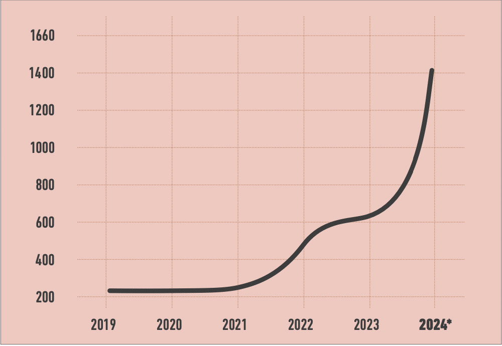 En se basant sur les données de janvier et février 2024, les chercheur·euses anticipent que ce chiffre devrait encore augmenter de façon fulgurante, pour atteindre 1400 mentions d’ici la fin de l’année, soit une augmentation de 659 % en cinq ans.