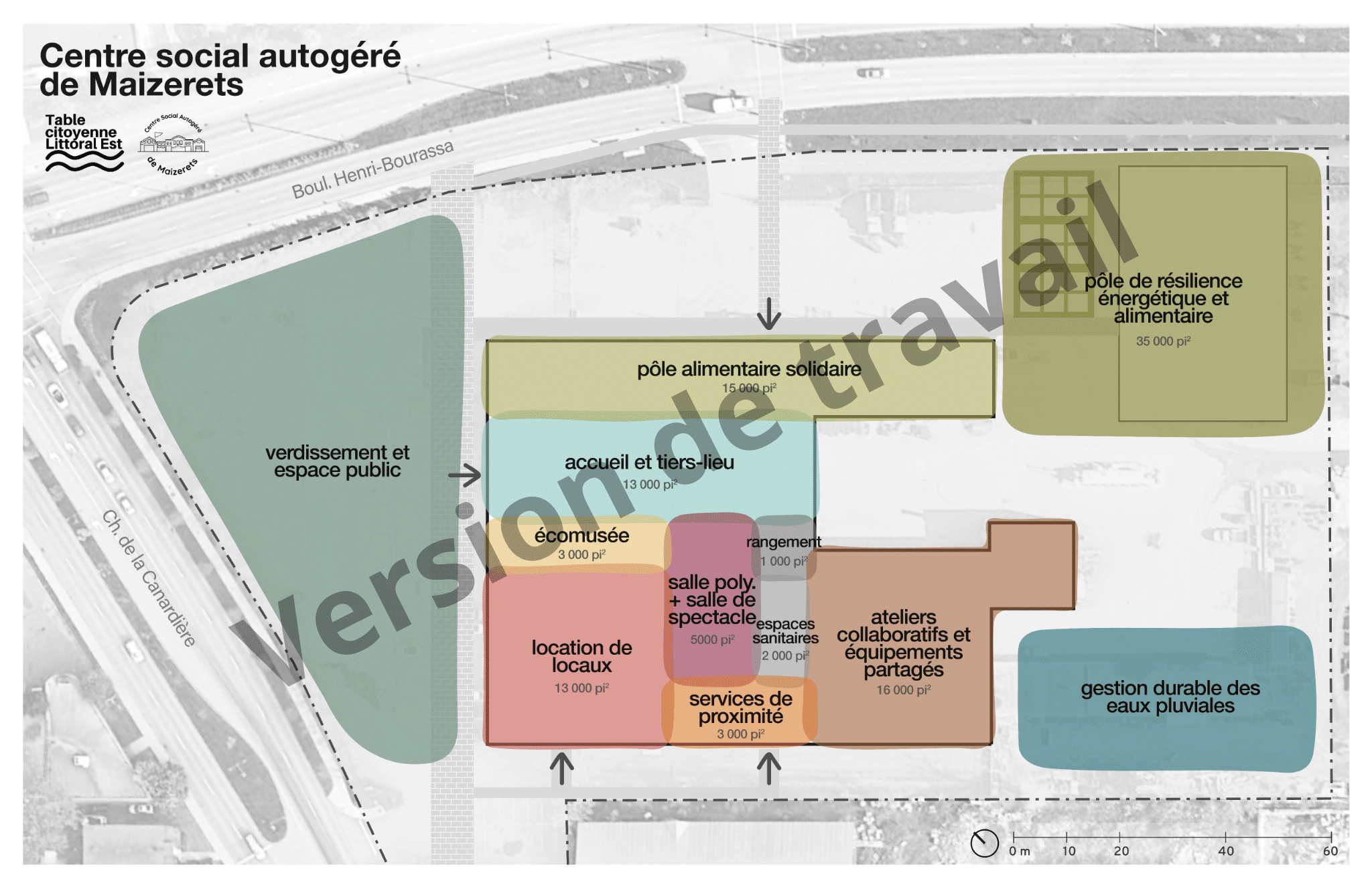 Grâce aux 92 600 pi2 de plancher du garage de la Canardière, on parle d’un « pôle alimentaire solidaire » en collaboration avec des organismes de sécurité alimentaire de la basse-ville, de locaux pour des organismes communautaires du coin, d’une salle polyvalente où organiser des spectacles, de services de proximité comme une buanderie ou une bibliothèque d’outils, mais aussi d’agriculture urbaine, d’un petit musée racontant l’histoire du bâtiment et du quartier, ou encore d’un « tiers-lieu », soit un endroit où on pourrait « exister sans avoir à payer », témoigne Marie-Hélène Deshaies.