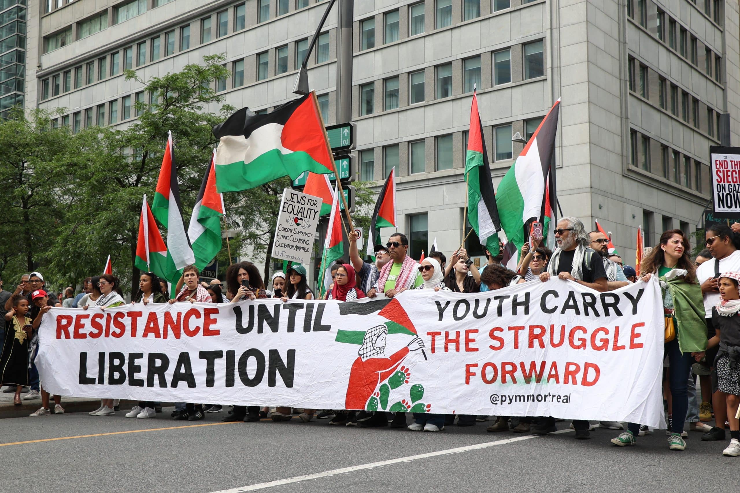 Vers 15 h, la manifestation hebdomadaire du Mouvement de la jeunesse palestinienne s’est arrêtée en bordure du square Victoria, sous forte présence policière. Une centaine de personnes étaient présentes.