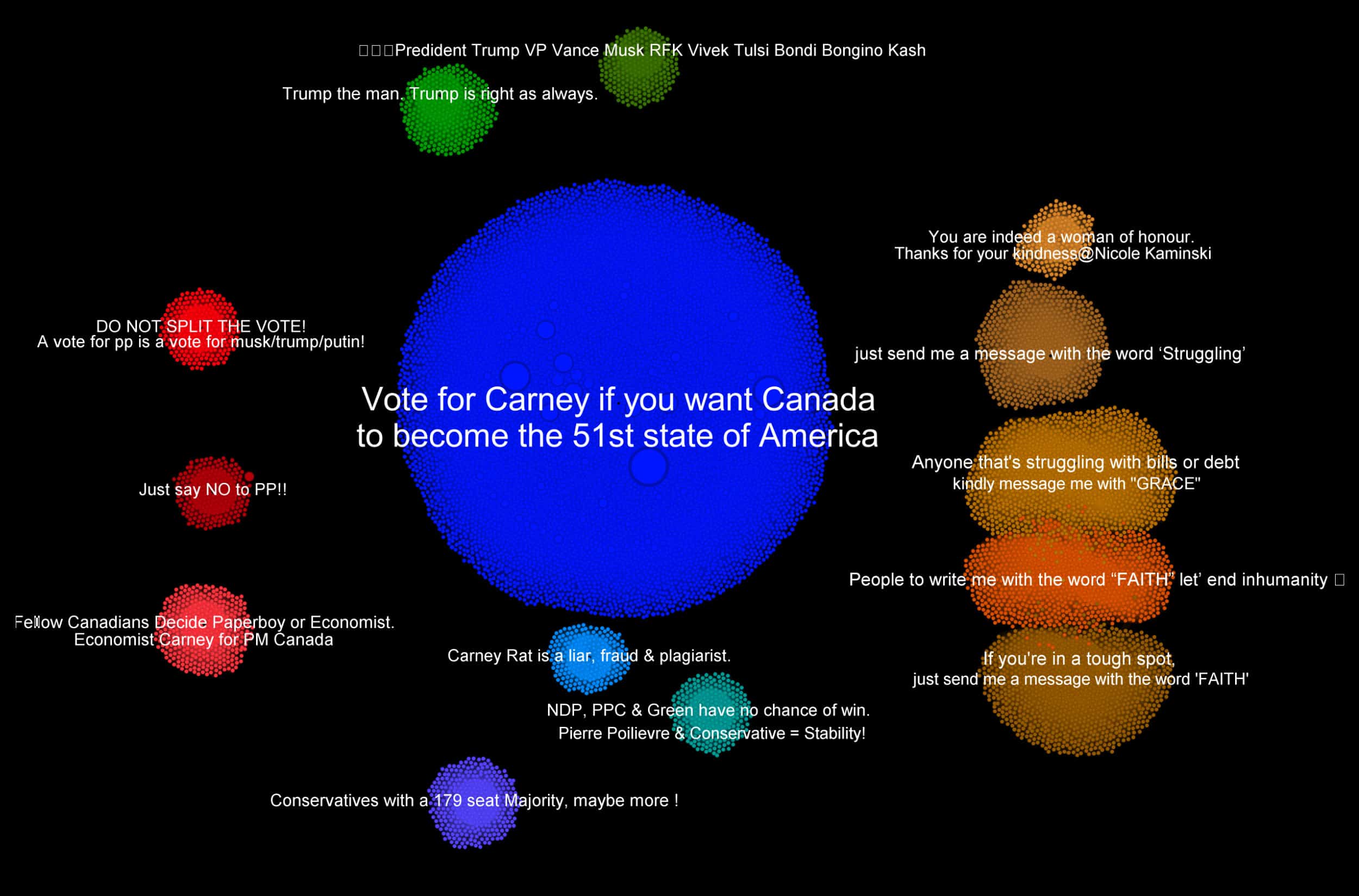 Une variante du message « Vote for Carney if you want Canada to become the 51st state of America » (« Votez pour Carney si vous voulez que le Canada devienne le 51e État américain ») a été recensée 10 000 fois. C’est donc de loin le message qui revient le plus souvent parmi les commentaires dupliqués.