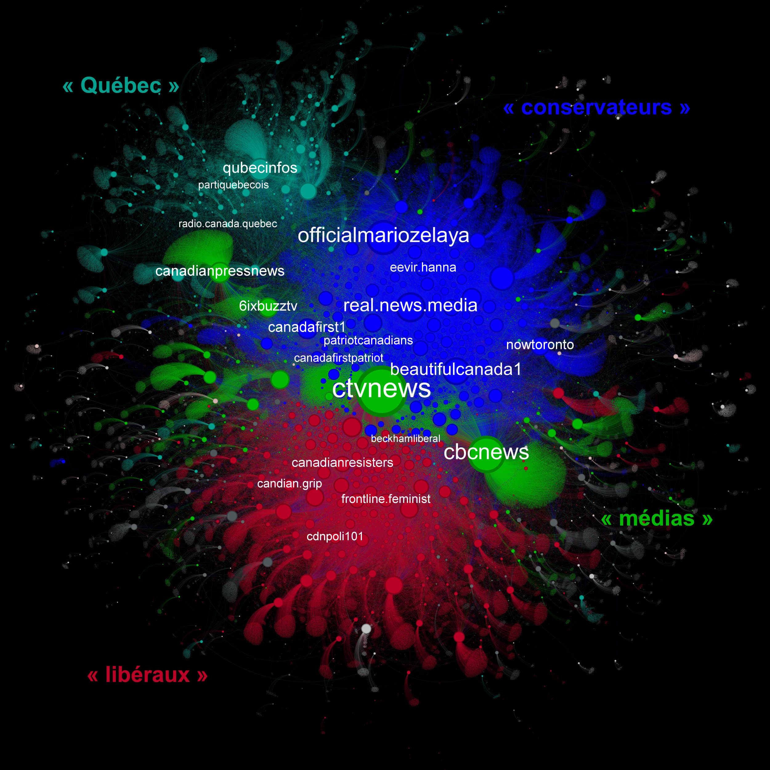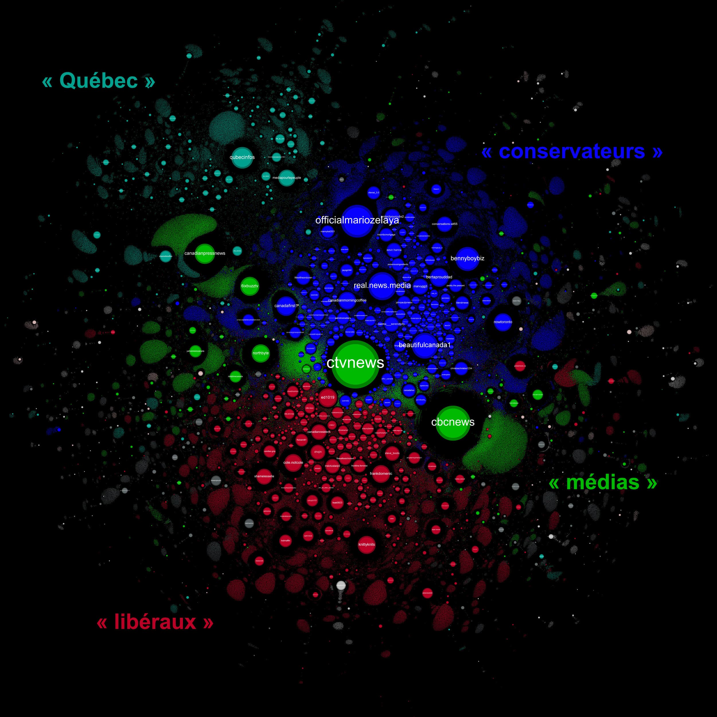 Le « Québec » : Cette communauté majoritairement francophone affiche un rejet du statu quo politique. Elle soutient le Bloc québécois (BQ), mais aussi les conservateurs. Cette catégorie est plus hétéroclite et on y trouve aussi une opposition envers les médias, les élites politiques et les institutions.