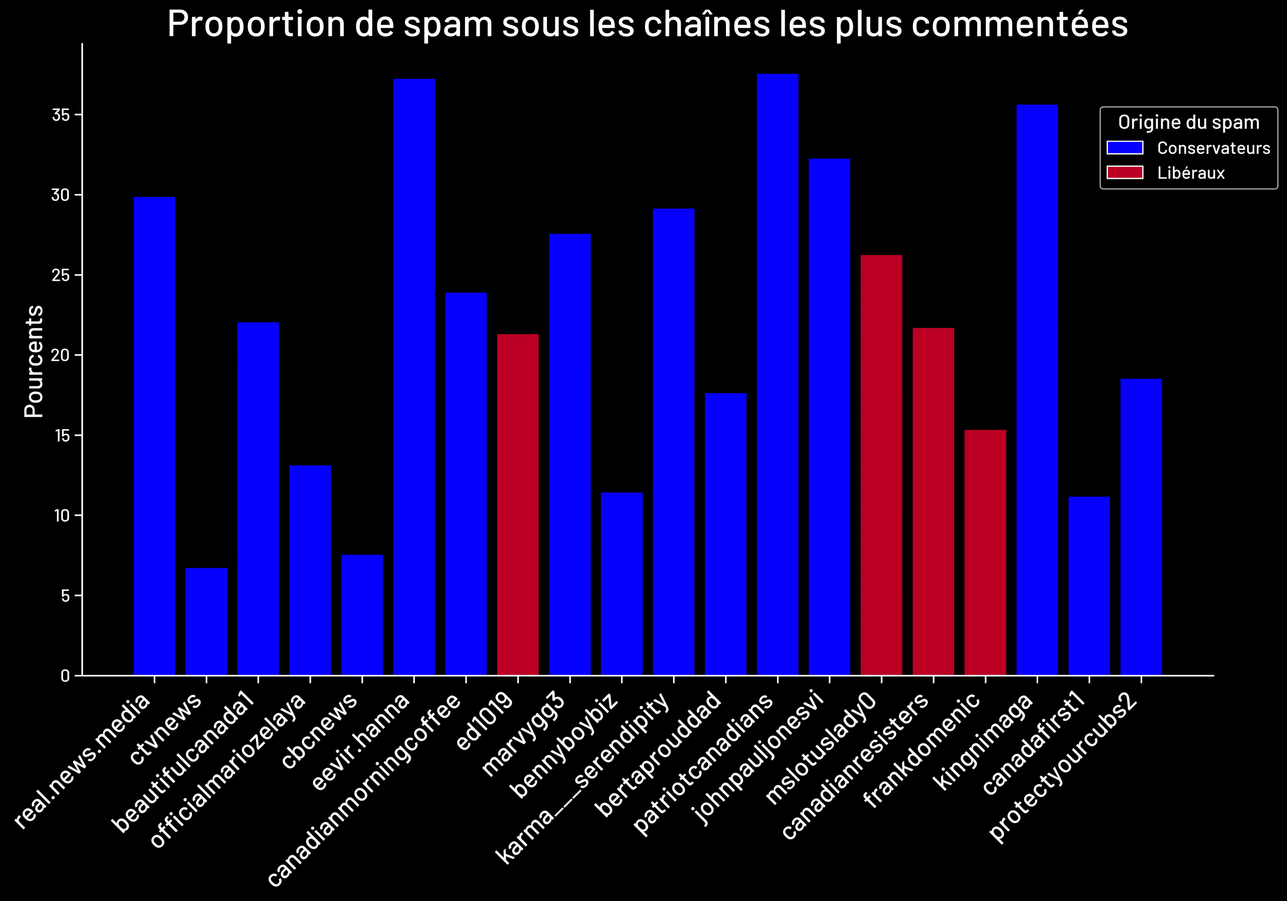 On note aussi que les comptes de spammeurs, essentiellement conservateurs, ont commenté les vidéos de chaînes de médias comme CTV News et CBC News, qui sont respectivement la deuxième et la cinquième chaînes les plus spammées en nombre total de commentaires.
