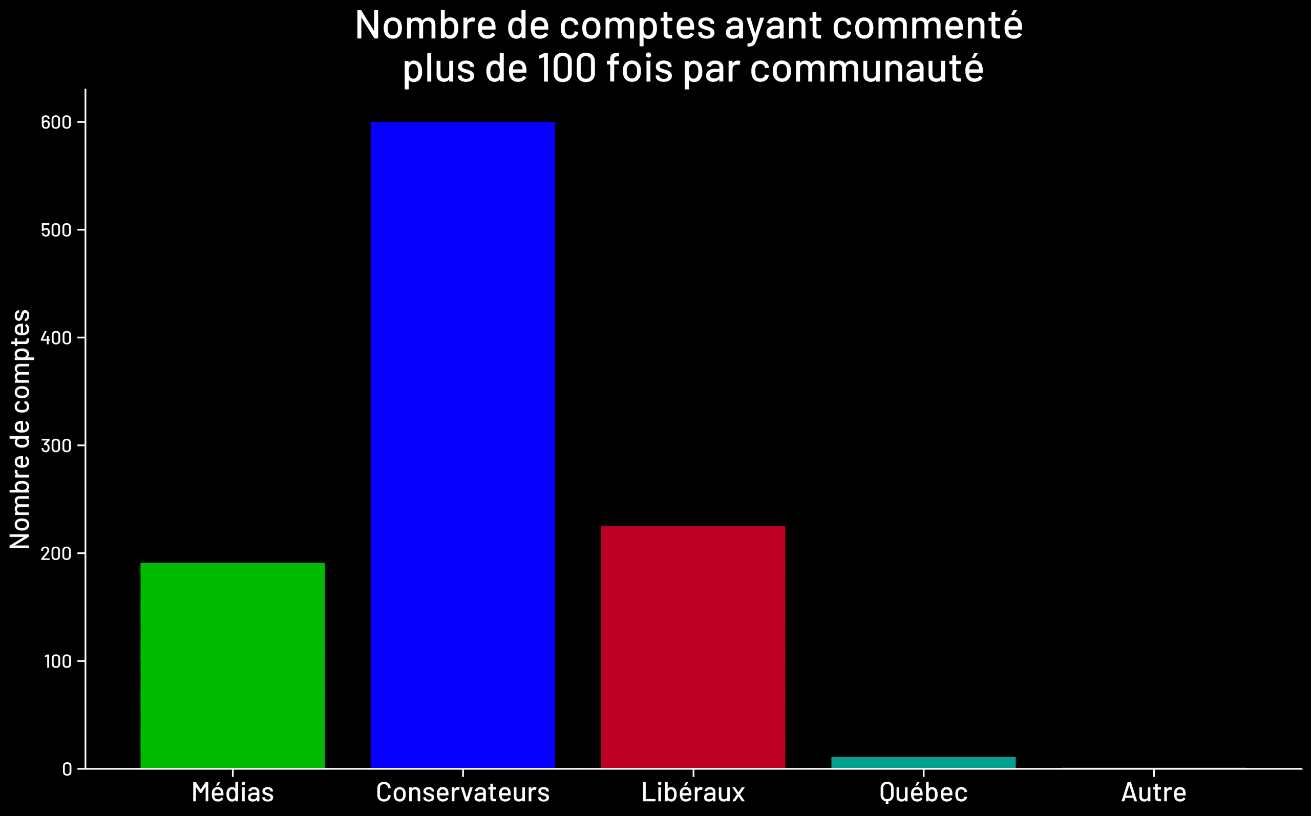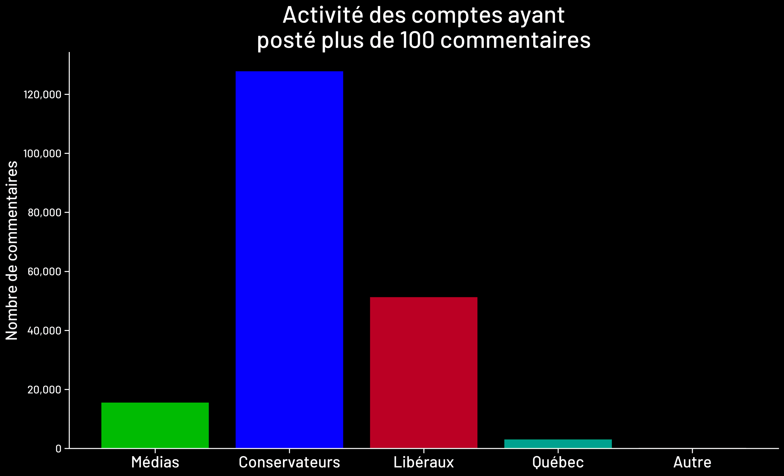 Nous avons décelé 928 comptes « spammeurs » qui ont commenté plus de 100 fois chacun, pour un total de plus de 176 000 commentaires en trois semaines. De ceux-ci, 128 000 commentaires sont associés à 600 comptes pro-conservateurs.