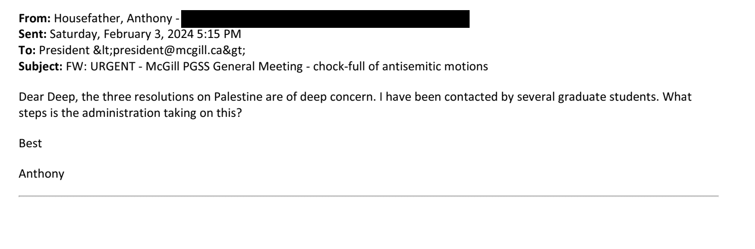 Le 3 février, Anthony Housefather renvoie au recteur un autre courriel dont l’objet est le suivant : « URGENT – Assemblée générale de la PGSS de McGill – pleine de motions antisémites ». Il écrit : « Cher Deep, les trois résolutions sur la Palestine suscitent de vives inquiétudes. J’ai été contacté par plusieurs étudiants diplômés. Quelles sont les mesures prises par l’administration à ce sujet? »