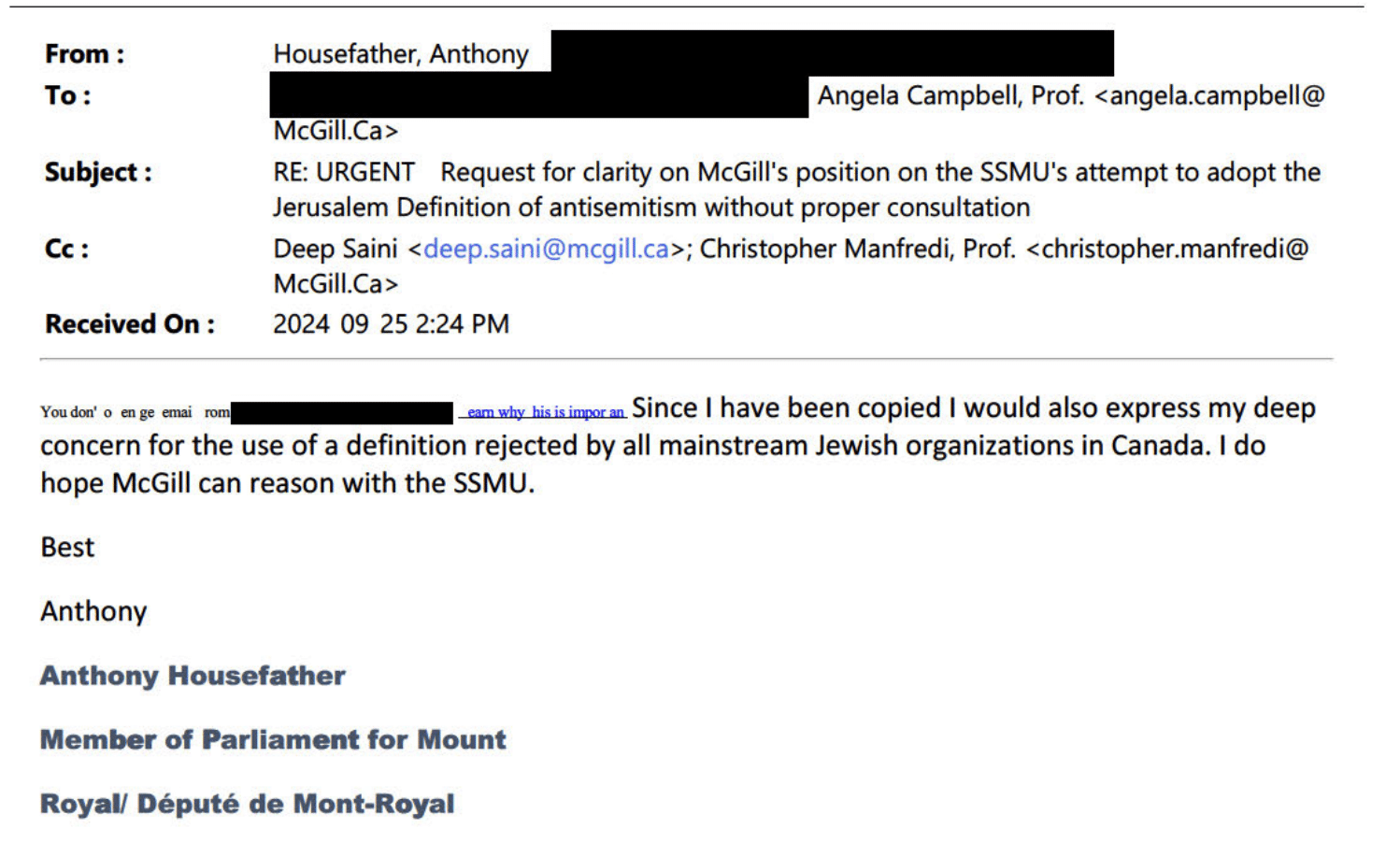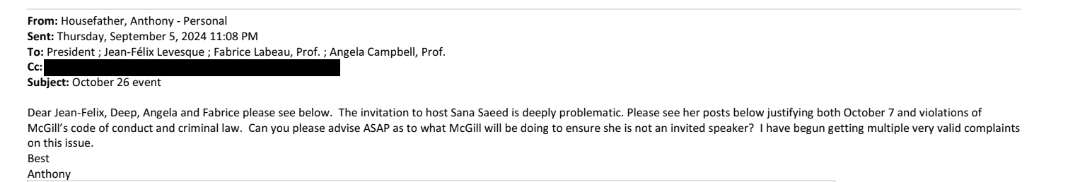 Le 5 septembre, Anthony Housefather écrit à plusieurs membres de l’administration, dont le recteur, pour s’opposer à sa venue. « L’invitation à accueillir Sana Saeed est profondément problématique. »