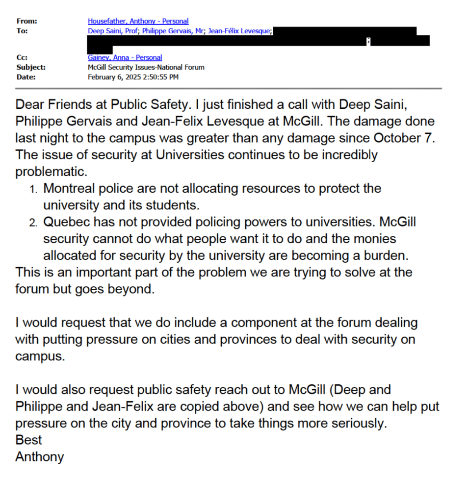 À la fin du message, le député Housefather demande aux représentant·es de Sécurité publique Canada de « communiquer directement avec McGill » dans le but de « voir comment nous pouvons les aider à faire pression sur la Ville et le gouvernement provincial pour qu’ils prennent les choses plus au sérieux ».