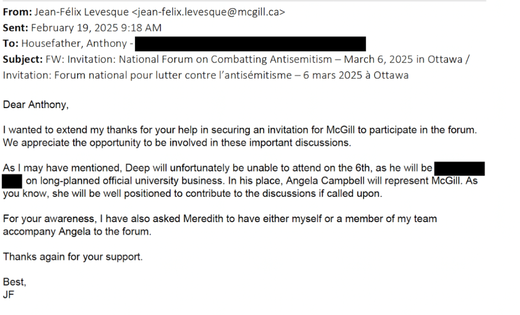 Pourtant, d’autres échanges courriel entre Anthony Housefather et les administrateurs de McGill révèlent que le député a réussi à obtenir une invitation afin que l’université y soit représentée.