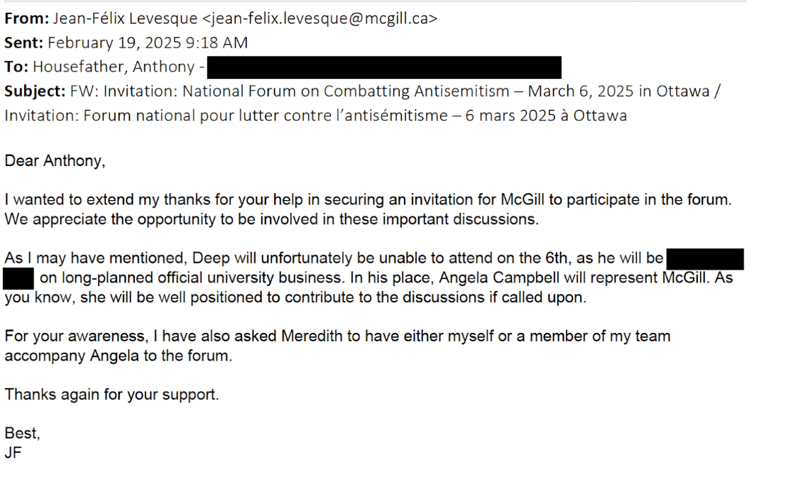 Pourtant, d’autres échanges courriel entre Anthony Housefather et les administrateurs de McGill révèlent que le député a réussi à obtenir une invitation afin que l’université y soit représentée.