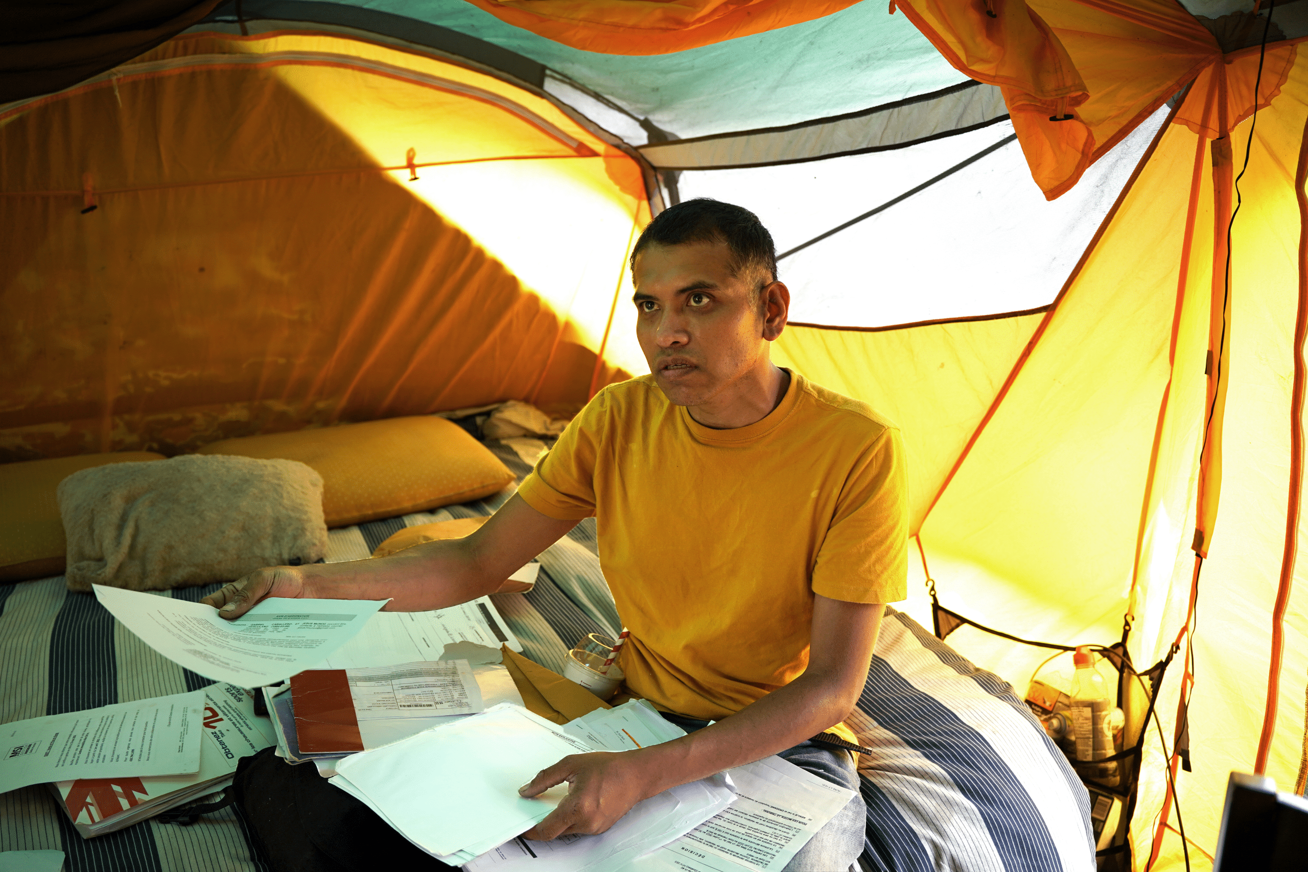 Dans sa tente, il déballe trois dossiers remplis de documents juridiques et les étale sur son lit. À quelques centimètres de là, le sol devant le poêle à bois qui lui a permis de se réchauffer l’hiver dernier est criblé de petites brûlures, traces fantomatiques laissées par les braises.